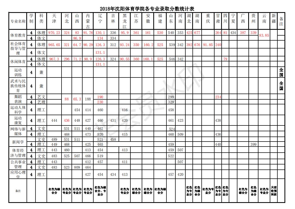 2018年沈阳体育学院各专业录取分数